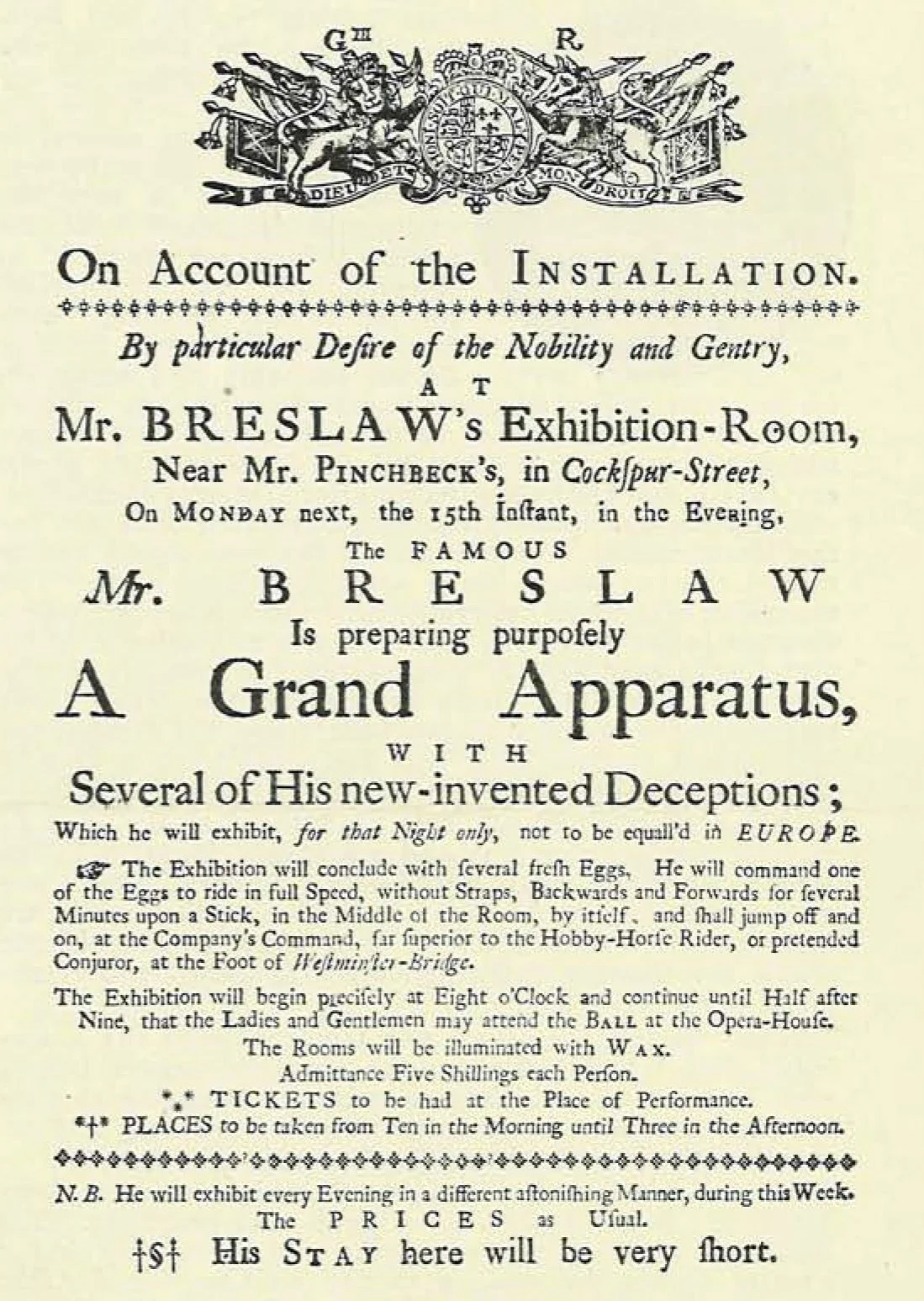 In 1780 Breslaw was appearing at the Great Room in Canton street. Haymarket, and a year later at Greenwood Room, in the Haymarket. He was then living at 23 Haymarket. His advertisement of May 30th in this year shows that he was then playing in two places on the same night.